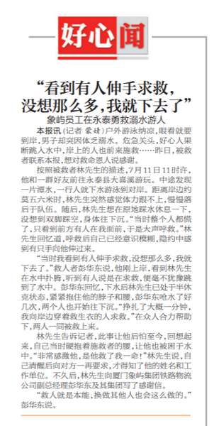 林先生介绍,7月11日,他和几位朋友前往永泰县大喜溪游玩,中途在水潭游泳。距离岸边约莫五六米时,他突然感觉体力不支,想脚踩潭底休息一下,却两脚踩空,身体直往下沉。慌乱中,隐隐约约看到前面有人,他就大声呼救:“过来帮我!”